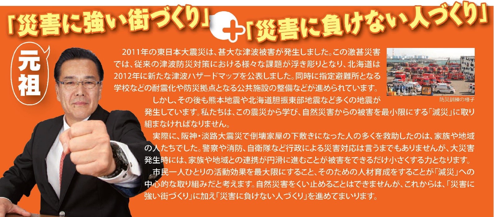 消防官として培った経験を活かし、これからの防災行政を提案、万一の大災害にも迅速に対応できる体制の構築を促してきました。2020年2月末に北海道は、新型コロナウイルスの感染が拡大したことから独自の「緊急事態宣言」を発令しました。その後、全国にコロナ感染症が拡大し、2年間で第5波まで至りました。これも一つの災害と捉えるならば、今の市役所の体制は、危機管理室だけで十分とは言えません。情報管理を主眼に危機管理室と秘書広報課を統合した情報管理室を創設し、情報を一元的に発信していくことが市民により分かりやすく、安心感も与えることにつながると考えます。